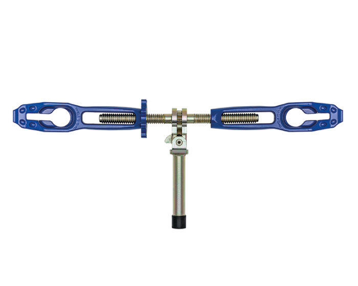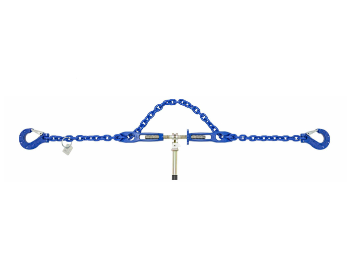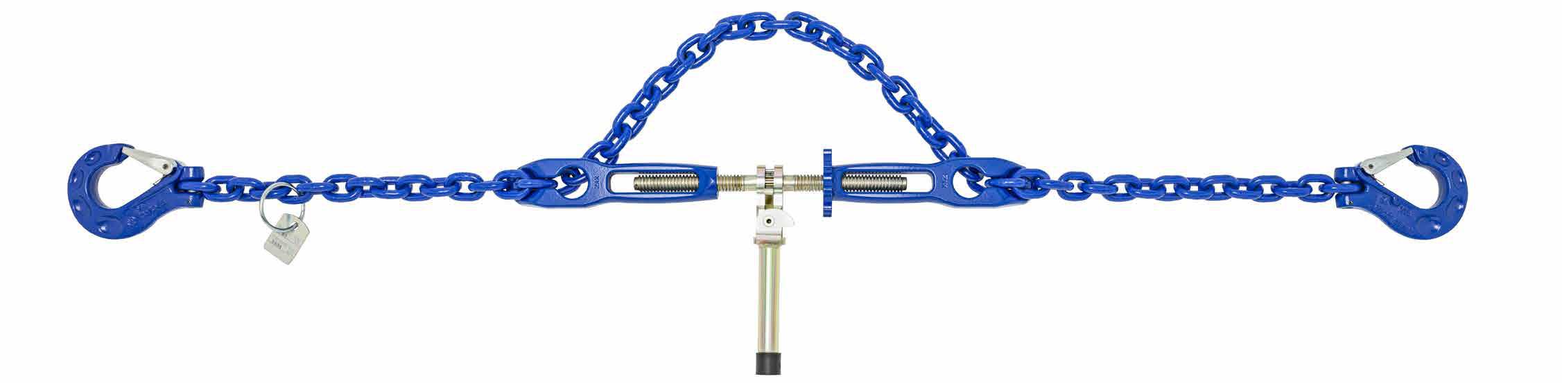 The grade 100 lashing chain tensioners with shortening claws on both sides TWN 1460 are used as tensioning elements in lashing chains. The chain tensioners can be positioned anywhere in the lashing chain and have a large clamping range. All functions (clamping, locking, unclamping) are carried out by the handy designed folding lever. Due to the folding lever, the chain tensioners are compact and require little storage space.